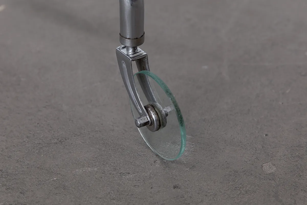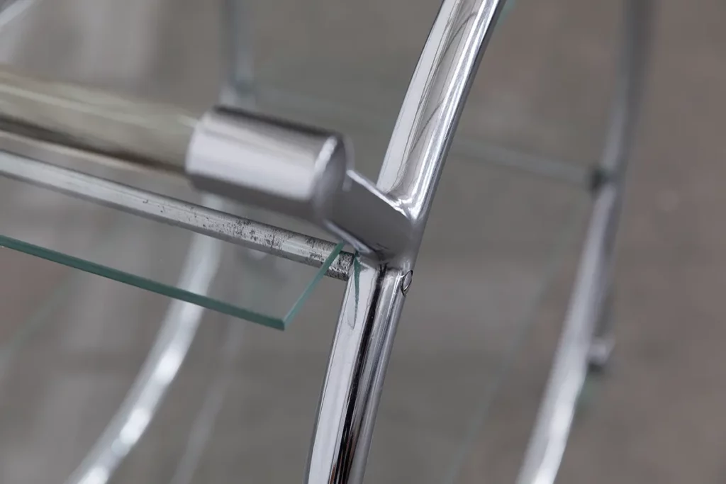 Material: verchromtes Stahlrohr, polierte Glasscheiben, polierte Glasräder, Kristallglasgriff