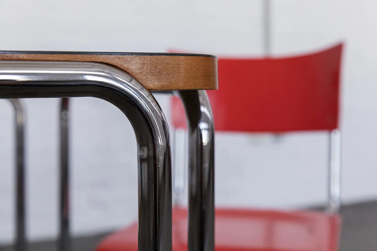 Das Design des von uns angebotenem Stahlrohr Esstisches basiert auf einem B 10 Vorkriegs-Entwurf von Marcel Breuer.