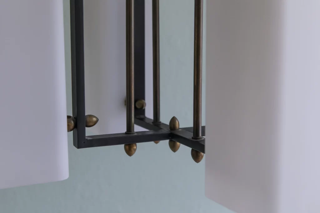 Six opal glass shades are arranged in a balanced configuration around the central structure. They diffuse the light softly and evenly, introducing a calm, atmospheric quality that contrasts with the graphic clarity of the metal framework.