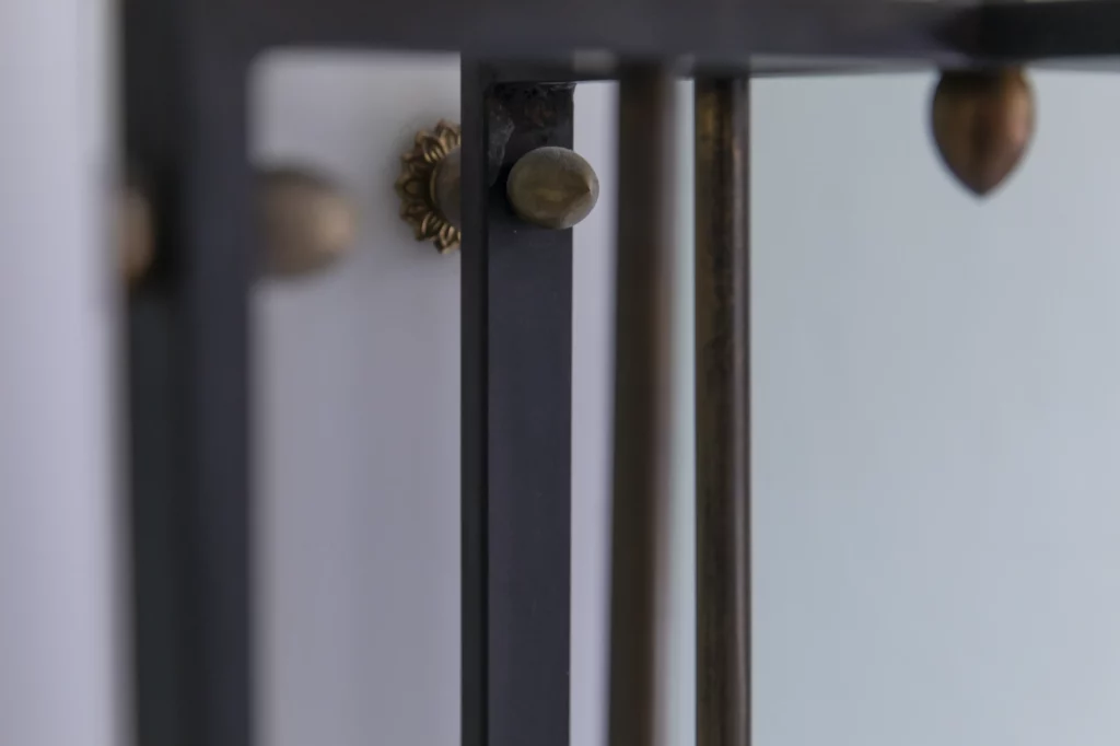 The bronzed brass frame forms a precisely articulated, architectural structure. Vertical rods and rectilinear connecting elements create an open and rational composition, while carefully executed details reveal a strong connection to craftsmanship and material expression typical of the mid-century period.