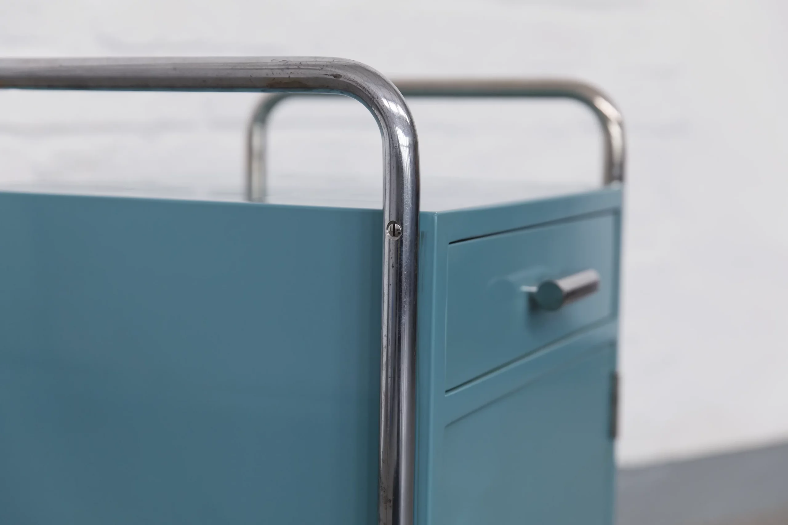 Thonet Bauhaus nachttisch, um 1930 – stahlrohr, petrol, mit zylindrischen bauhaus-griffen