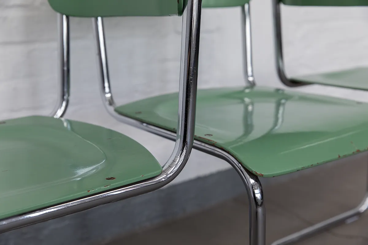 Beautiful Bauhaus chair group by the czechoslovakian tubular steel furniture manufacturer Rudolf Vichr from the 1930s. The chairs are in best unrestored condition and wear the original reseda green color. The company Rudolf Vichr is one of the most important Modernist furniture producer in Czechoslovakia before the 2nd world war. In addition to tubular steel furniture in Bauhaus Design Rudolf Vichr also implemented functionalist designs of czechoslovakion architects before the 2nd world war.