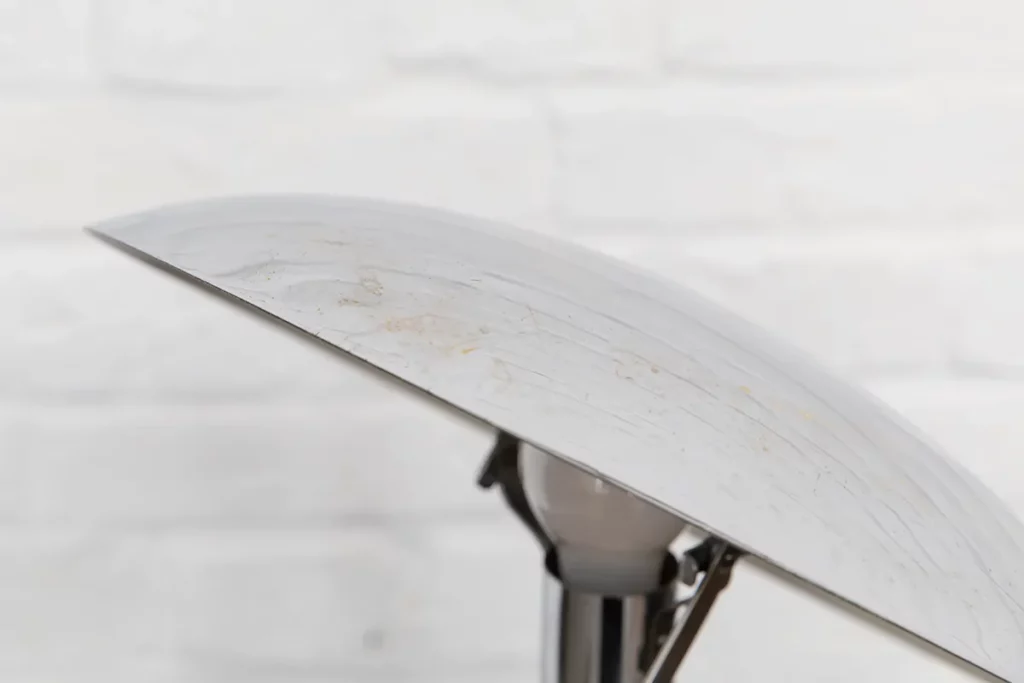 The composition of nickel-plated parts, with the galvanization deliberately omitted from the top of the base, lends the lamp a distinctive charm. The effect makes the otherwise silver lamp appear with a delicate golden glow at the base, giving it a unique character.