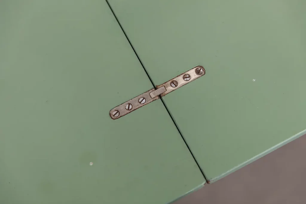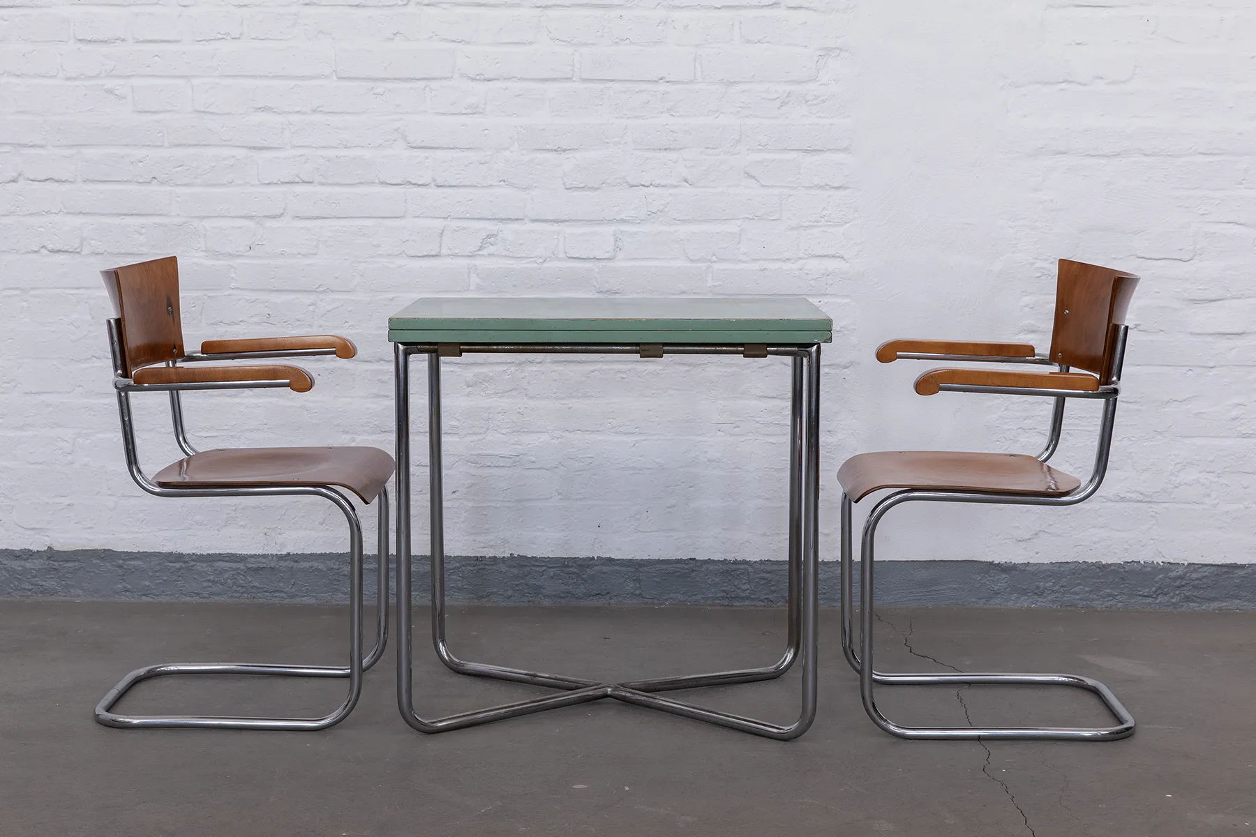 This foldable tubular steel table in Bauhaus style was produced by the Czechoslovakian tubular steel furniture manufacturer Robert Slezak. The table still retains its original paint in a typical Reseda green Bauhaus color and is in good condition with a beautifully aged patina.