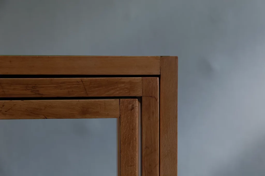 The set consists of three graduated tables that can be used individually as side tables or nested together to form a compact console. The clean, rectilinear structure in lightly stained solid wood gives the design a warm, natural presence, while the tabletops present a distinctive three-tone lacquered finish – a vibrant colour composition typical of the era, offering a lively counterpoint to the geometric form.