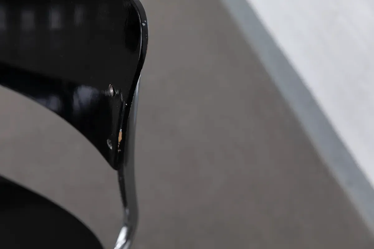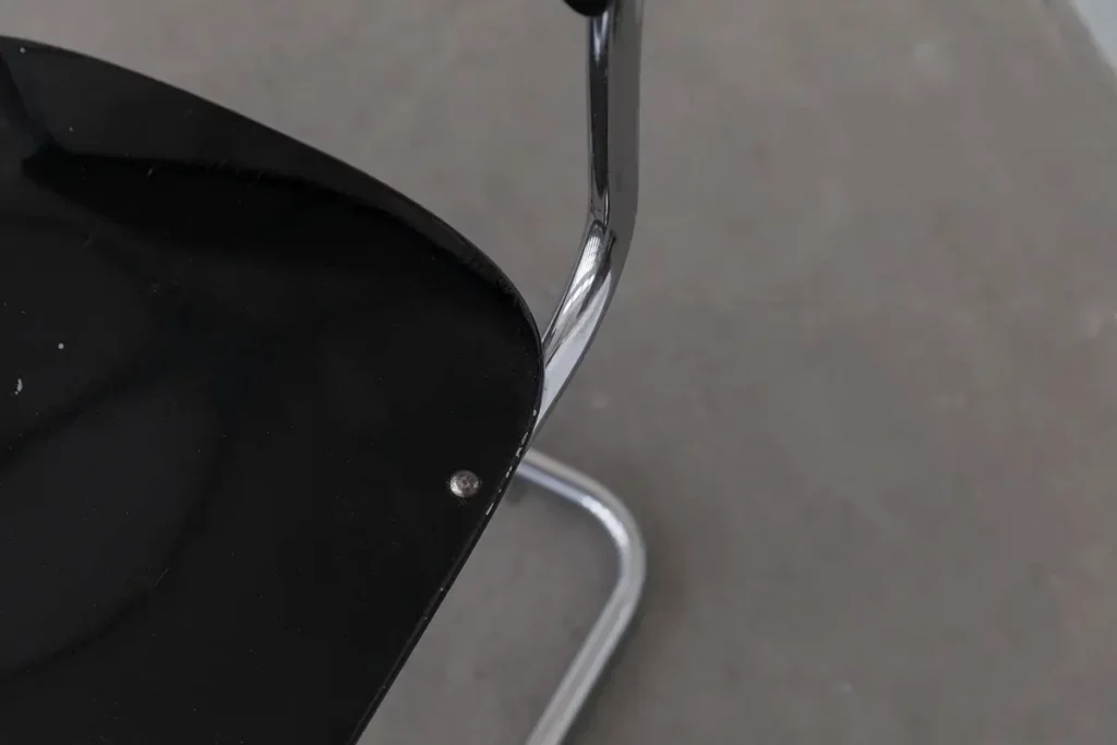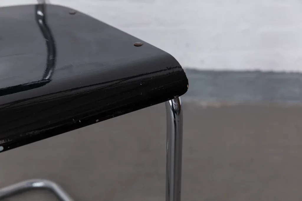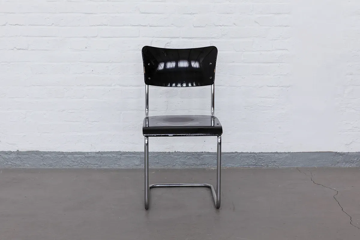 The RB351P model has been manufactured by Mauser since 1939, following the clear, functional aesthetic of Bauhaus modernism. The frame is made of chrome-plated tubular steel, while the seat and backrest are crafted from molded plywood with the original black lacquer finish.