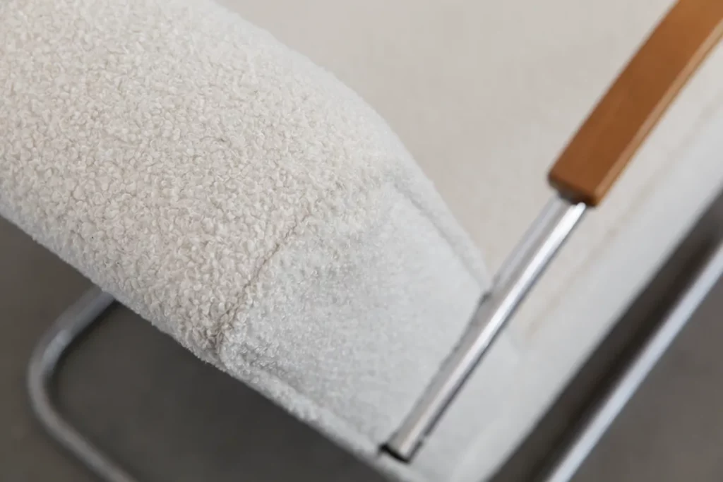 For this version, a consciously chosen light cream-colored plush fabric (Himalaya) was used. It softens the appearance of the chair and introduces a new kind of lightness – without forgetting the design’s historical roots.
