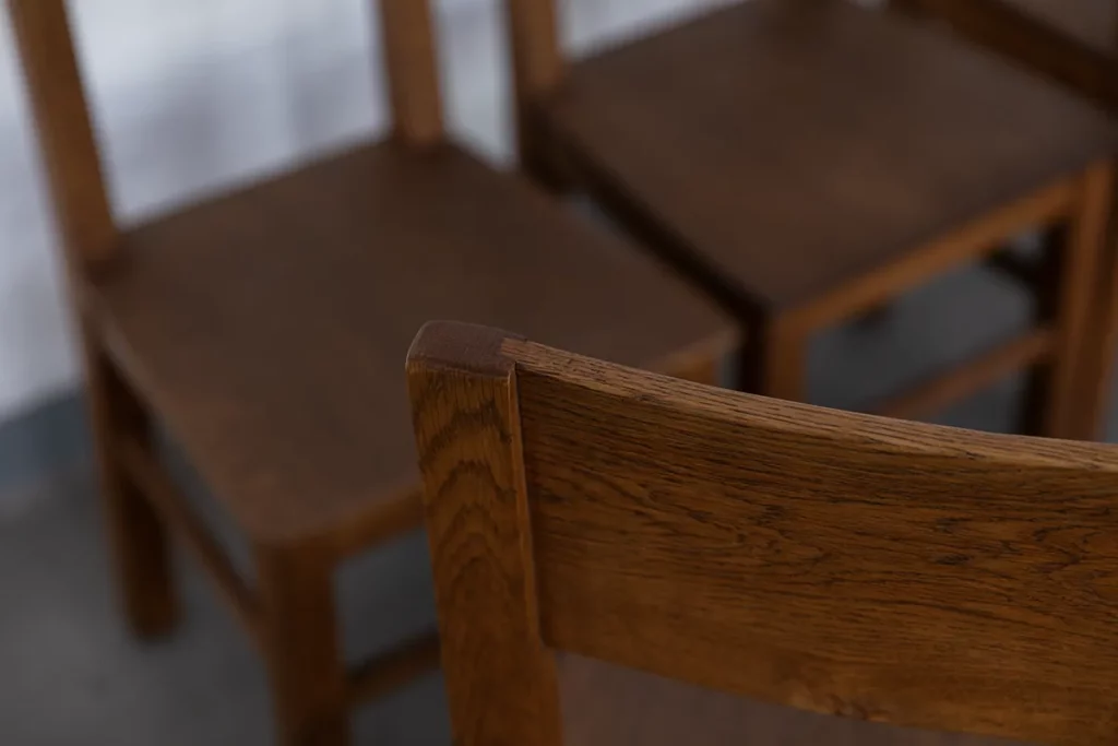 Made of oak, the chairs feature a robust yet elegant structure. The rectangular backrest and simple seat reflect the principles of New Objectivity, emphasizing reduction to the essential and practical functionality.